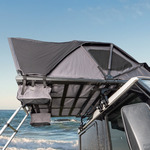 Carpa de techo con un nuevo diseño de despliegue manual, adecuada para coches, furgonetas y todoterrenos. La tienda de techo se despliega rápidamente. Está equipada con mosquiteras en todas las aberturas (3 lados), 2 prácticos bolsillos para zapatos en la entrada exterior, un cómodo colchón de 7 cm de grosor y una escalera telescópica de aluminio. La base está formada por un robusto armazón de aluminio.