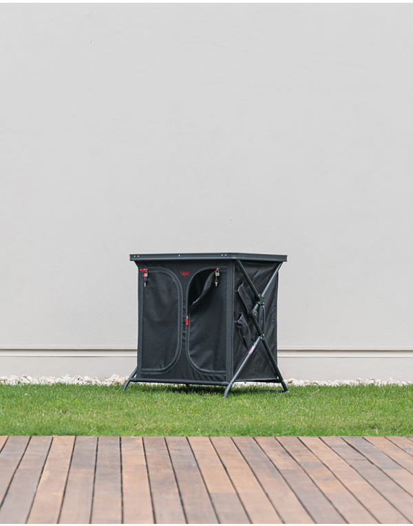 Armario de cocina muy estable y robusto. ¡Muy fácil de apertura gracias a su exclusivo sistema de plegado! Este armario para cocinar con almacenaje está equipado con un tablero superior de HPL (laminado alta presión) color Gris resistente a altas temperaturas y humedad. La estructura es de aluminio pintado epoxy color negro. La cubierta está fabricada con poliéster super resistente 600D y alberga prácticas estanterías dentro. Las patas se pueden ajustar individualmente y tienen conteras autoniveladoras, para asegurar una estabilidad total sobre cualquier superficie. Bolsa de transporte y candado incluidos. Dimensiones del tablero: 56,5x92 cm.