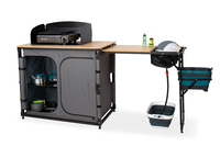 La cocina de camping está lista para usar en segundos gracias a su práctico sistema de montaje rápido. Todas las cocinas cuentan con una encimera de bambú, una estructura ligera de aluminio, resistentes estantes de MDF y un cortavientos