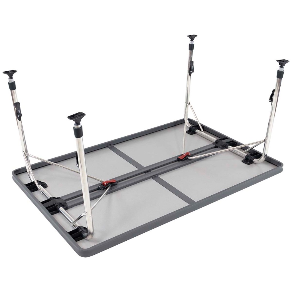 Una mesa lujosa y elegante. Esta ligera mesa de camping cuenta con un tablero resistente al calor e impermeable. Sus patas de ajuste continuo (63-74 cm) se pliegan para un transporte fácil y compacto. Sus patas estabilizadoras garantizan estabilidad en cualquier superficie.